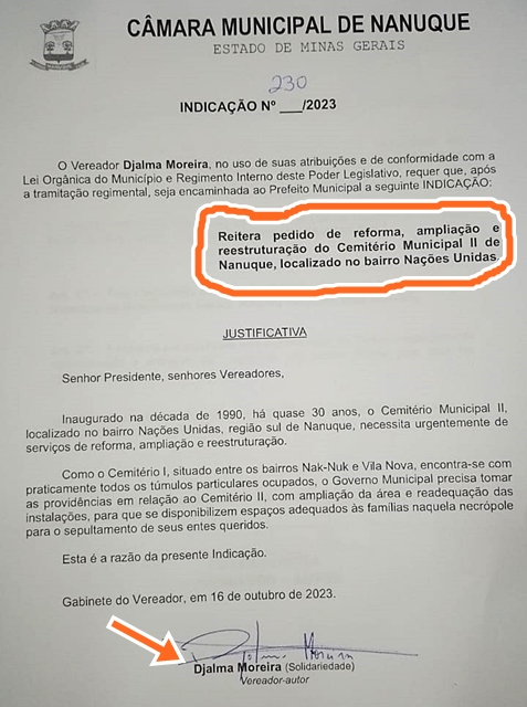 O vereador Djalma Moreira reiterou mais uma vez o pedido de reforma, ampliação e reestruturação do Cemitério Municipal II de Nanuque, localizado no bairro Nações Unidas. Documento foi apresentado na sessão da Câmara na segunda-feira passada (16/10).